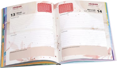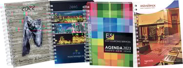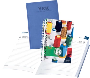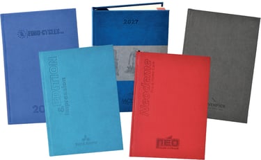 Disponibles en reliure spirale ou en reliure cousue-collée pour une solidité et un confort d’utilisation optimaux, nos agendas peuvent également être dotés d’une couverture imprimée en quadrichromie ou réalisés sur un support thermo de luxe, proposé en plusieurs coloris.